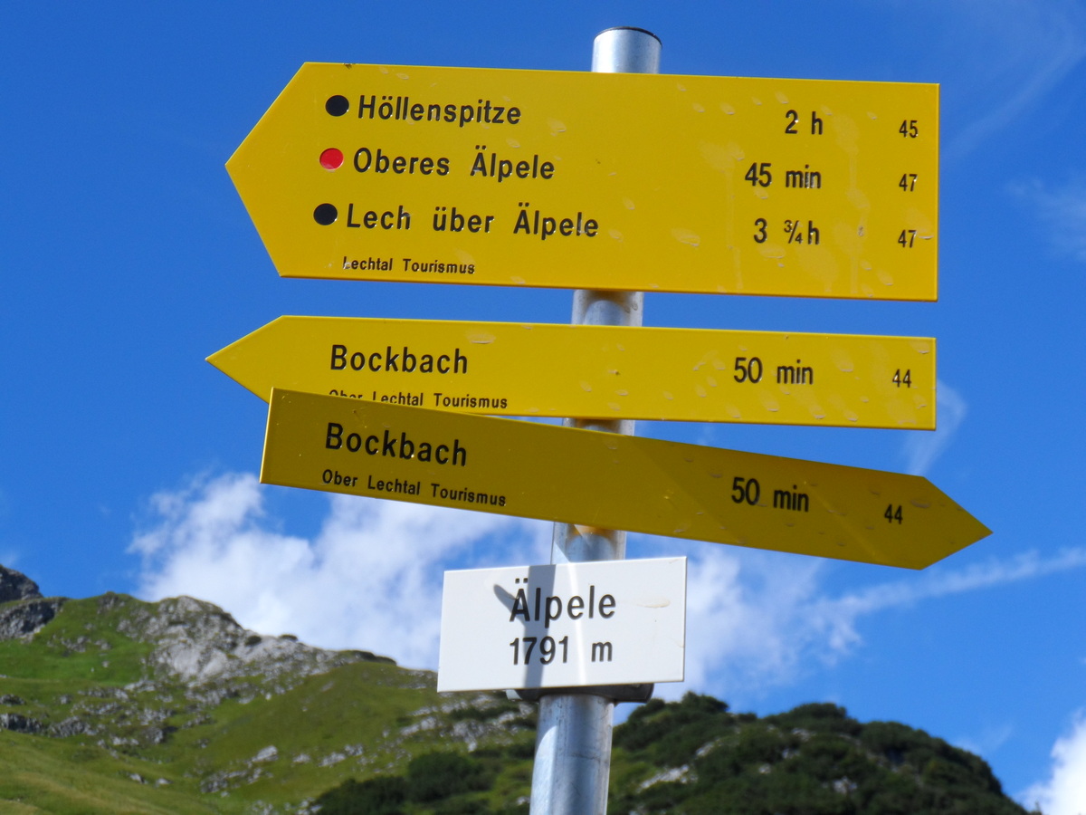The Älpele is an alpine pasture in the Bockbach valley near Steeg. It is situated at 1791 m above sea level above the Bockbachalm. The starting point of the hike to the Älpele is the Bockbach junction on the main road in the direction of Warth. There are plenty of parking spaces and there is also a bus stop there. The path continues along an asphalted road, past the Alpine village of Birchetsgump to the front Bockbachalm. The Bockbachalm is on the left immediately after the bridge over the Bockbach. Up to here the hike runs on a narrow but asphalted road. At the Bockbach alpine pasture, a narrow path begins, which immediately becomes quite steep. It goes up the remaining 330 meters in constant gradient to Älpele hut, which is visible from afar. The alpine pasture is open from June to the end of September — but since summer season 2017 no more hosting! The walking time from the Bockbach junction is about 2 to 2.5 hours.
