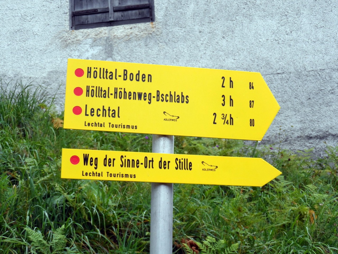 Der Weg der Sinne bezeichnet einen Wandersteig in der Umgebung von Bschlabs. Die Besonderheit dieses Weges sind die ausgestellten Kunstwerke aus Holz, Stein und Edelstahl. Die Werke sind von einheimischen Künstlern gestaltet und teilweise mit passenden Sprüchen und Gedichten versehen. Der Weg der Sinne beginnt unterhalb der Wallfahrtskirche "Maria Schnee" in Bschlabs. Auf einem Steig folgt man der Beschilderung "Weg der Sinne" zum Streinbach hinab. Über eine alte Fußgängerhängebrücke wird dieser überquert. Auf der anderen Talseite erreicht man nach einer kurzen Ansteigung den Ort der Stille. Wie der Name schon sagt handelt es sich um einen Ort in der akustischen Nullzone. Aufgrund von Frequenzüberlagerungen wird die absolute Ruhe höchstens von Geräuschen in der unmittelbaren Nähe unterbrochen. An diesem Punkt endet der Weg der Sinne. Es ist zu empfehlen das kurze Stück weiter bis zur Hölltalschlucht zu wandern und anschließend den Rückweg über den Bschlaber Höhenweg anzutreten oder weiter nach Boden zu wandern. Um ausreichend Zeit für die Betrachtung der Kunstwerke zu haben sollte man je nach weiterer Wegauswahl mit zweinhalb Stunden (nach Boden) bzw. mit dreieinhalb Stunden (Bschlaber Höhenweg nach Bschlabs) rechnen. (Fotos von Esther Kerber: Weg der Sinne - Bschlaber Höhenweg)